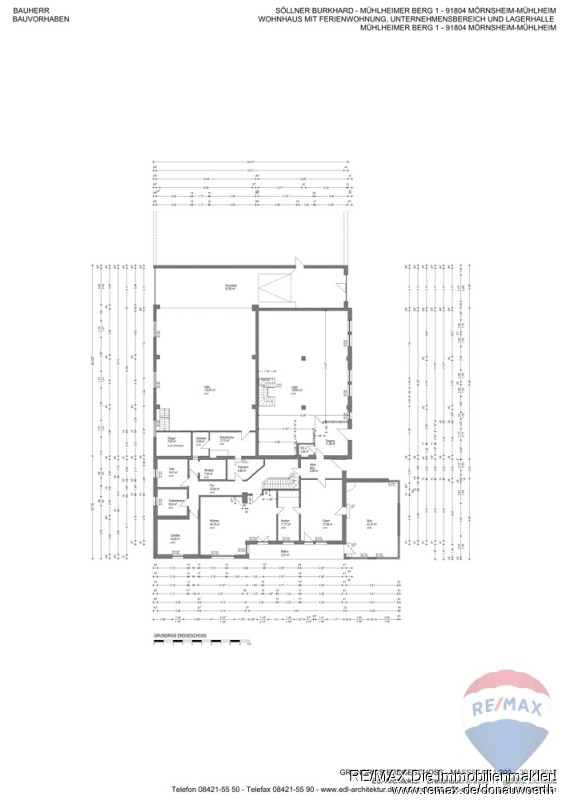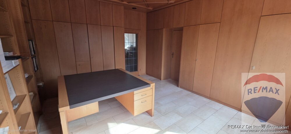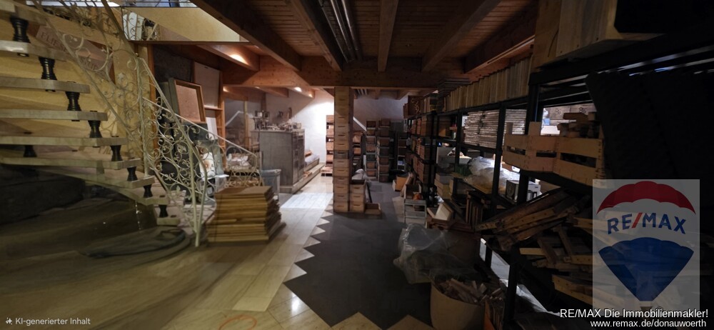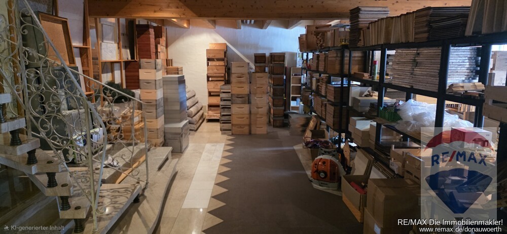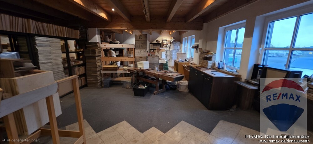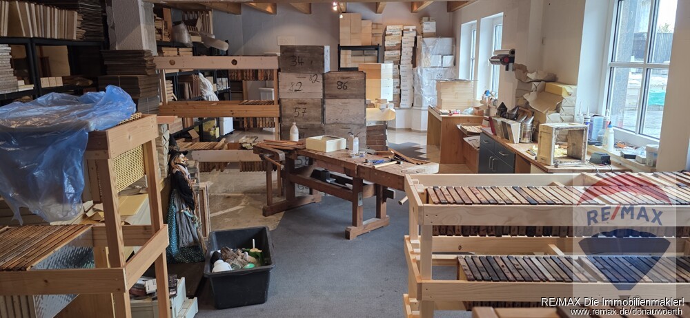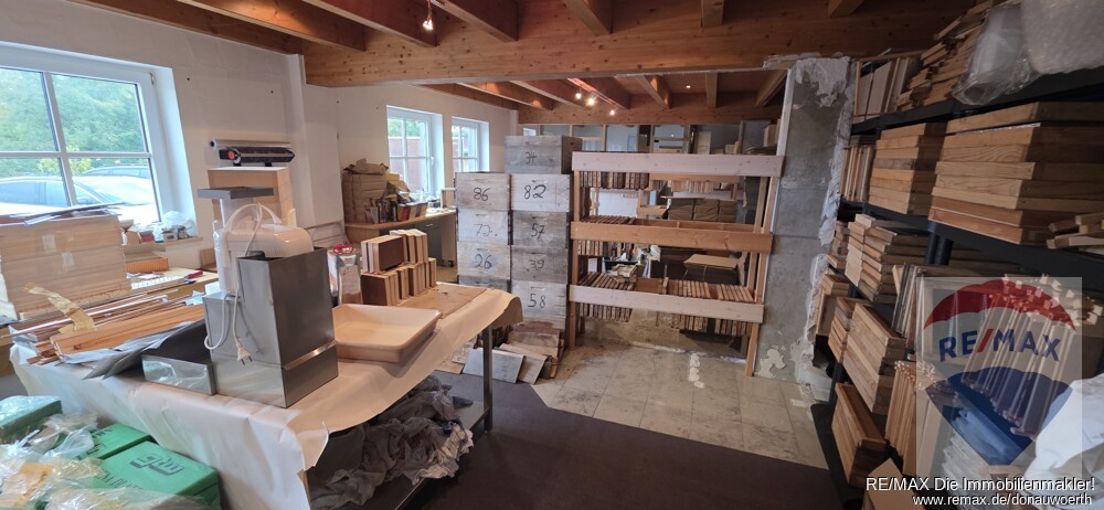 Der Gewerbebereich mit 485 m² umfasst zwei Büros sowie zwei Ausstellungsräume- und eine Hallenfläche, die vielfältige Nutzungsmöglichkeiten bietet.