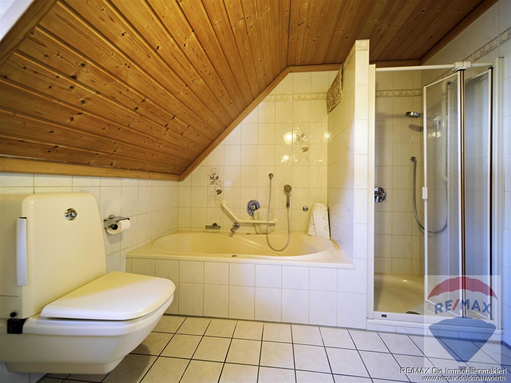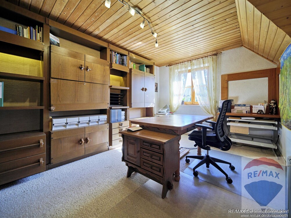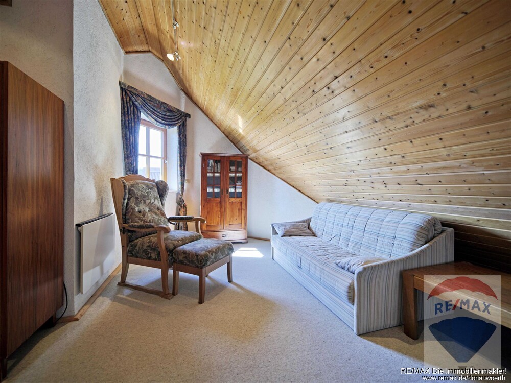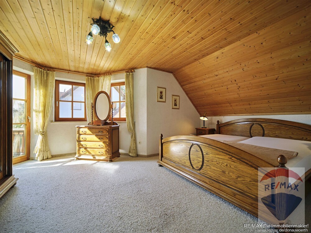 Im Obergeschoss befinden sich drei gut geschnittene Schlafzimmer, die sich ideal als Kinder-, Gäste- oder Arbeitszimmer nutzen lassen. Das Hauptschlafzimmer verfügt über einen direkten Zugang zum Balkon, der einen schönen Blick in den Garten bietet. Ein geräumiges Badezimmer mit Badewanne und Dusche rundet das Angebot im Obergeschoss ab. Das Dachgeschoss ist ausgebaut und bietet auf rund 30m² weitere Wohnfläche.